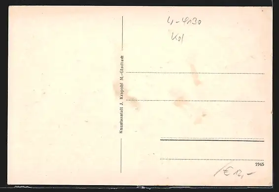 Personenbezogene Daten auf der Rückseite der Karte wurden durch blauen Textmarker unkenntlich gemacht. Die blauen Stellen sind auf die Vorderseite durchgeweicht und wirken sich negativ auf das Postkartenfoto aus