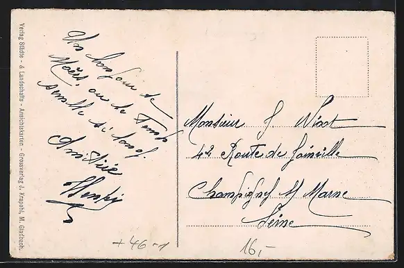 Personenbezogene Daten auf der Rückseite der Karte wurden durch blauen Textmarker unkenntlich gemacht. Die blauen Stellen sind auf die Vorderseite durchgeweicht und wirken sich negativ auf das Postkartenfoto aus