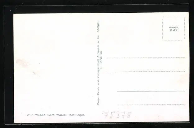 Personenbezogene Daten auf der Rückseite der Karte wurden durch blauen Textmarker unkenntlich gemacht. Die blauen Stellen sind auf die Vorderseite durchgeweicht und wirken sich negativ auf das Postkartenfoto aus