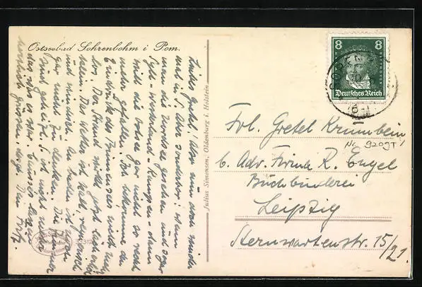 Personenbezogene Daten auf der Rückseite der Karte wurden durch blauen Textmarker unkenntlich gemacht. Die blauen Stellen sind auf die Vorderseite durchgeweicht und wirken sich negativ auf das Postkartenfoto aus
