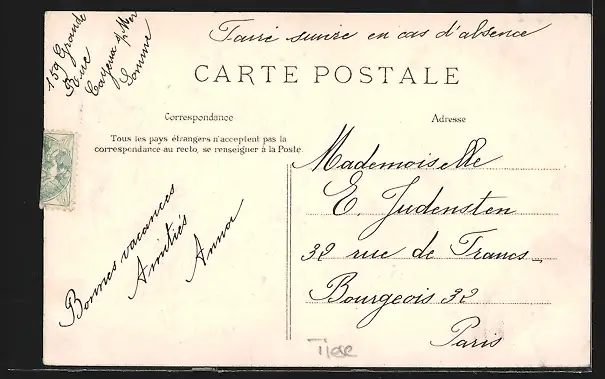 Personenbezogene Daten auf der Rückseite der Karte wurden durch blauen Textmarker unkenntlich gemacht. Die blauen Stellen sind auf die Vorderseite durchgeweicht und wirken sich negativ auf das Postkartenfoto aus
