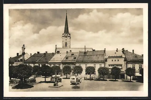 AK Mohelnice, Strassenpartie mit Denkmälern