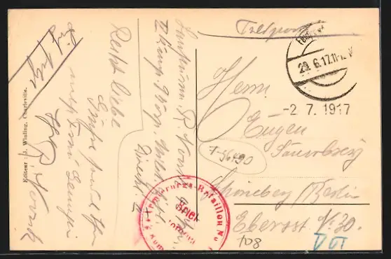 Personenbezogene Daten auf der Rückseite der Karte wurden durch blauen Textmarker unkenntlich gemacht. Die blauen Stellen sind auf die Vorderseite durchgeweicht und wirken sich negativ auf das Postkartenfoto aus