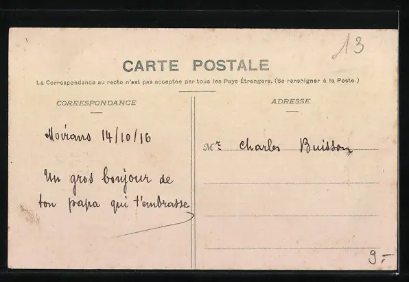 Personenbezogene Daten auf der Rückseite der Karte wurden durch blauen Textmarker unkenntlich gemacht. Die blauen Stellen sind auf die Vorderseite durchgeweicht und wirken sich negativ auf das Postkartenfoto aus