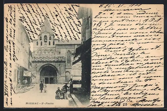AK Moissac, Église Saint-Pierre et scène de rue animée