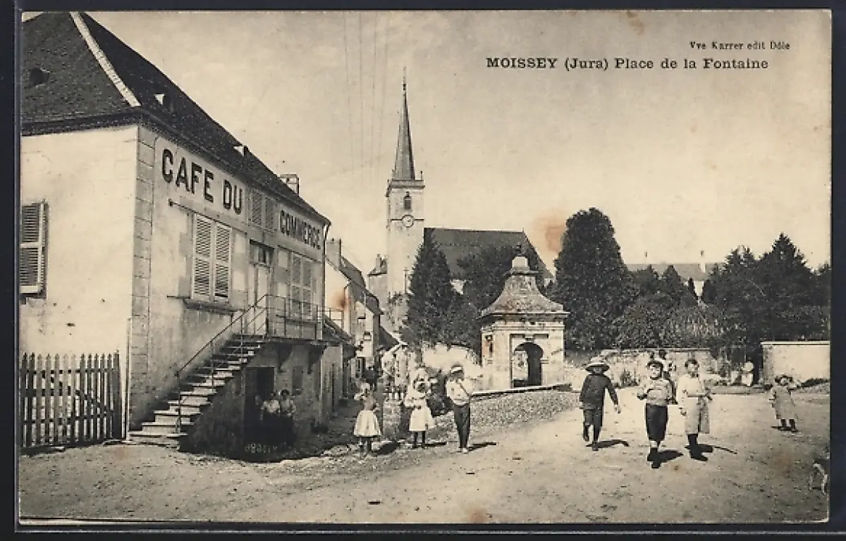 AK Moissey /Jura, Place de la Fontaine animée avec le Café du Commerce et vue de l`église
