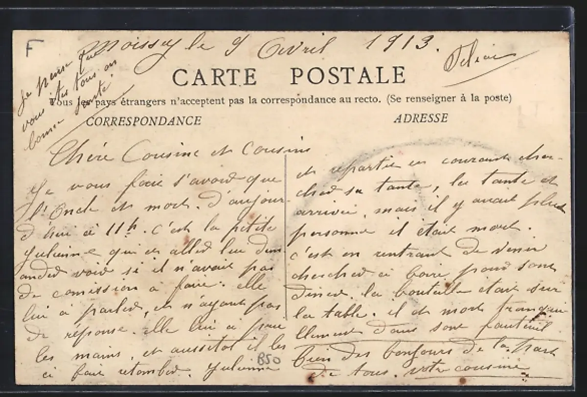 Personenbezogene Daten auf der Rückseite der Karte wurden durch blauen Textmarker unkenntlich gemacht. Die blauen Stellen sind auf die Vorderseite durchgeweicht und wirken sich negativ auf das Postkartenfoto aus