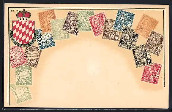 AK Monaco, Briefmarken und Wappen mit Krone