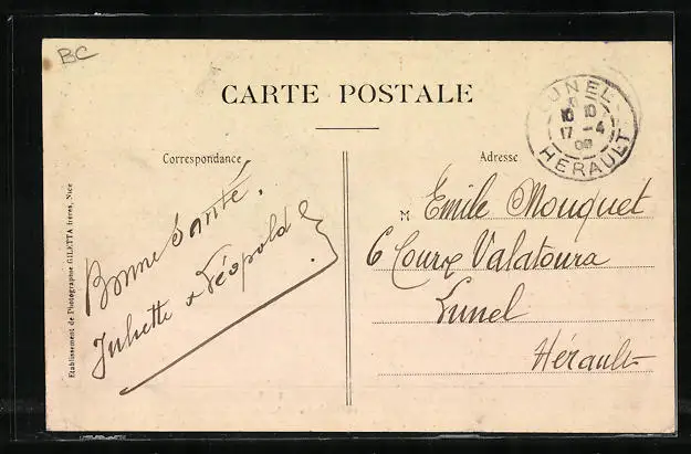 Personenbezogene Daten auf der Rückseite der Karte wurden durch blauen Textmarker unkenntlich gemacht. Die blauen Stellen sind auf die Vorderseite durchgeweicht und wirken sich negativ auf das Postkartenfoto aus