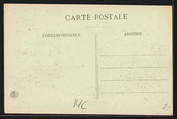 Personenbezogene Daten auf der Rückseite der Karte wurden durch blauen Textmarker unkenntlich gemacht. Die blauen Stellen sind auf die Vorderseite durchgeweicht und wirken sich negativ auf das Postkartenfoto aus