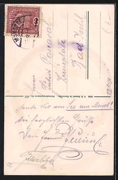 Personenbezogene Daten auf der Rückseite der Karte wurden durch blauen Textmarker unkenntlich gemacht. Die blauen Stellen sind auf die Vorderseite durchgeweicht und wirken sich negativ auf das Postkartenfoto aus