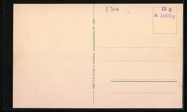 Personenbezogene Daten auf der Rückseite der Karte wurden durch blauen Textmarker unkenntlich gemacht. Die blauen Stellen sind auf die Vorderseite durchgeweicht und wirken sich negativ auf das Postkartenfoto aus