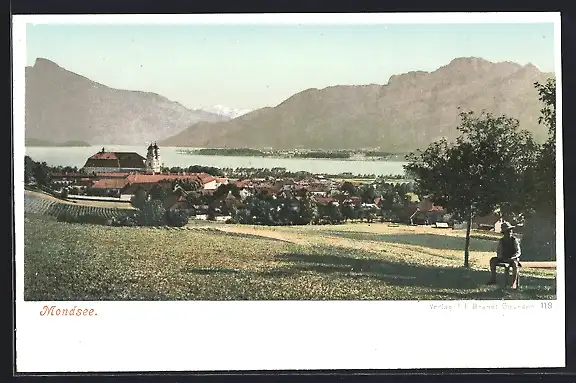 AK Mondsee, Teilansicht und auf einer Bank sitzender Junge