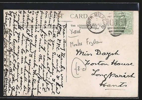 Personenbezogene Daten auf der Rückseite der Karte wurden durch blauen Textmarker unkenntlich gemacht. Die blauen Stellen sind auf die Vorderseite durchgeweicht und wirken sich negativ auf das Postkartenfoto aus