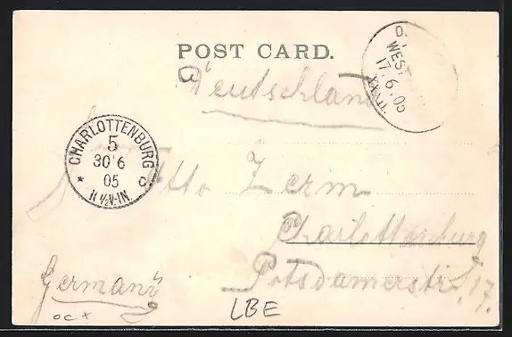 gelaufen 1905, Briefmarke entfernt, minimaler Einriss li. mittig, guter Zustand