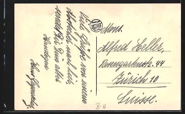 Personenbezogene Daten auf der Rückseite der Karte wurden durch blauen Textmarker unkenntlich gemacht. Die blauen Stellen sind auf die Vorderseite durchgeweicht und wirken sich negativ auf das Postkartenfoto aus