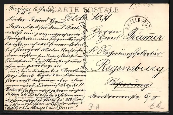 Personenbezogene Daten auf der Rückseite der Karte wurden durch blauen Textmarker unkenntlich gemacht. Die blauen Stellen sind auf die Vorderseite durchgeweicht und wirken sich negativ auf das Postkartenfoto aus