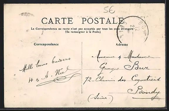 Personenbezogene Daten auf der Rückseite der Karte wurden durch blauen Textmarker unkenntlich gemacht. Die blauen Stellen sind auf die Vorderseite durchgeweicht und wirken sich negativ auf das Postkartenfoto aus