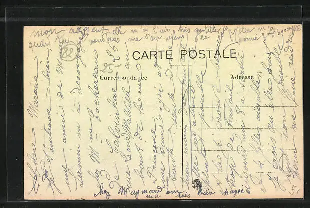 Personenbezogene Daten auf der Rückseite der Karte wurden durch blauen Textmarker unkenntlich gemacht. Die blauen Stellen sind auf die Vorderseite durchgeweicht und wirken sich negativ auf das Postkartenfoto aus