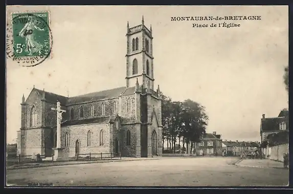 AK Montauban-de-Bretagne, Place de l`Église et vue de l`église monumentale