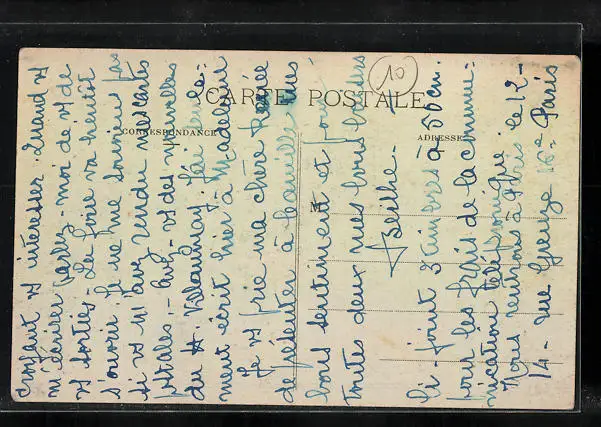 Personenbezogene Daten auf der Rückseite der Karte wurden durch blauen Textmarker unkenntlich gemacht. Die blauen Stellen sind auf die Vorderseite durchgeweicht und wirken sich negativ auf das Postkartenfoto aus