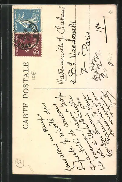 Personenbezogene Daten auf der Rückseite der Karte wurden durch blauen Textmarker unkenntlich gemacht. Die blauen Stellen sind auf die Vorderseite durchgeweicht und wirken sich negativ auf das Postkartenfoto aus