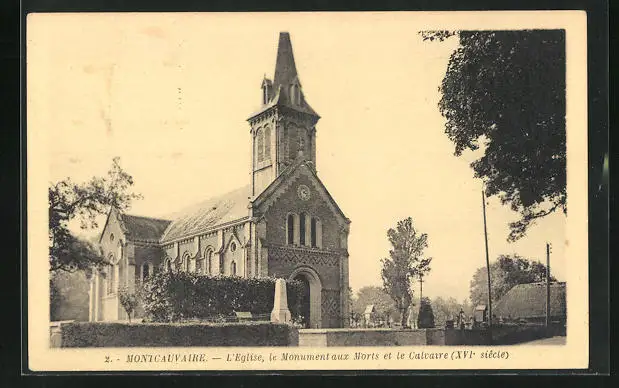 AK Montcauvaire, L`Eglise, le Monument aux morts et le Calvaire