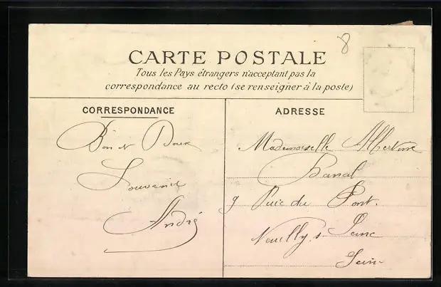 Personenbezogene Daten auf der Rückseite der Karte wurden durch blauen Textmarker unkenntlich gemacht. Die blauen Stellen sind auf die Vorderseite durchgeweicht und wirken sich negativ auf das Postkartenfoto aus