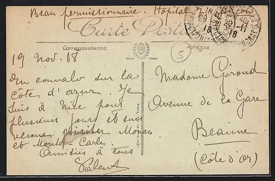 Personenbezogene Daten auf der Rückseite der Karte wurden durch blauen Textmarker unkenntlich gemacht. Die blauen Stellen sind auf die Vorderseite durchgeweicht und wirken sich negativ auf das Postkartenfoto aus