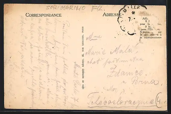 Personenbezogene Daten auf der Rückseite der Karte wurden durch blauen Textmarker unkenntlich gemacht. Die blauen Stellen sind auf die Vorderseite durchgeweicht und wirken sich negativ auf das Postkartenfoto aus