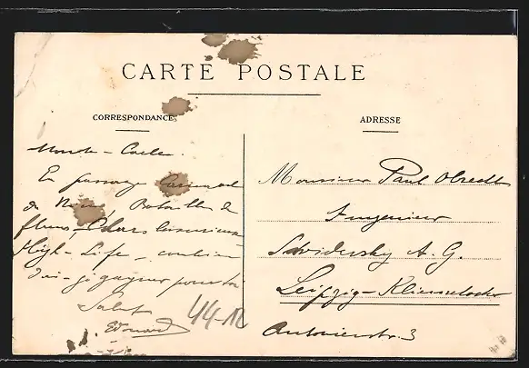 Personenbezogene Daten auf der Rückseite der Karte wurden durch blauen Textmarker unkenntlich gemacht. Die blauen Stellen sind auf die Vorderseite durchgeweicht und wirken sich negativ auf das Postkartenfoto aus