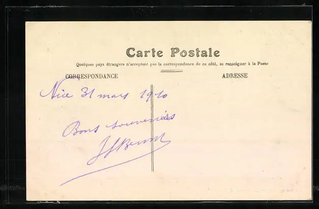 Personenbezogene Daten auf der Rückseite der Karte wurden durch blauen Textmarker unkenntlich gemacht. Die blauen Stellen sind auf die Vorderseite durchgeweicht und wirken sich negativ auf das Postkartenfoto aus