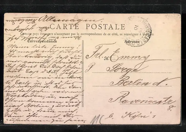 Personenbezogene Daten auf der Rückseite der Karte wurden durch blauen Textmarker unkenntlich gemacht. Die blauen Stellen sind auf die Vorderseite durchgeweicht und wirken sich negativ auf das Postkartenfoto aus