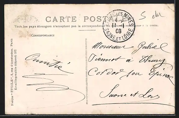 gelaufen 1908, Eckknicke li. oben, Briefmarke entfernt, guter Zustand