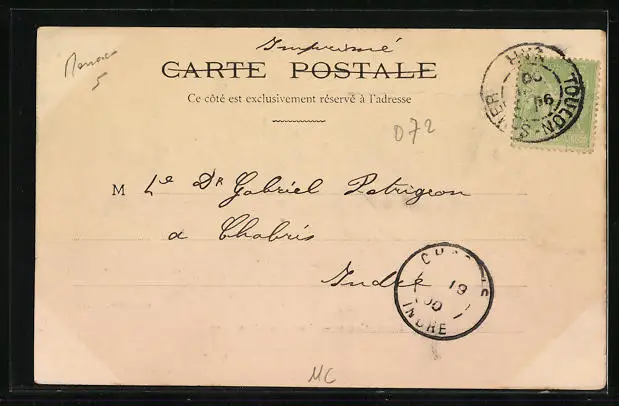 Personenbezogene Daten auf der Rückseite der Karte wurden durch blauen Textmarker unkenntlich gemacht. Die blauen Stellen sind auf die Vorderseite durchgeweicht und wirken sich negativ auf das Postkartenfoto aus