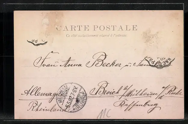 Personenbezogene Daten auf der Rückseite der Karte wurden durch blauen Textmarker unkenntlich gemacht. Die blauen Stellen sind auf die Vorderseite durchgeweicht und wirken sich negativ auf das Postkartenfoto aus
