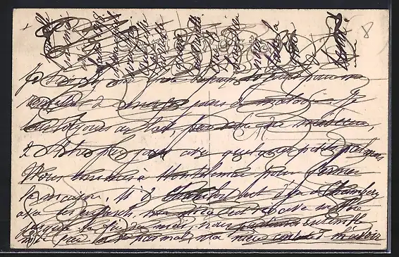 Personenbezogene Daten auf der Rückseite der Karte wurden durch blauen Textmarker unkenntlich gemacht. Die blauen Stellen sind auf die Vorderseite durchgeweicht und wirken sich negativ auf das Postkartenfoto aus