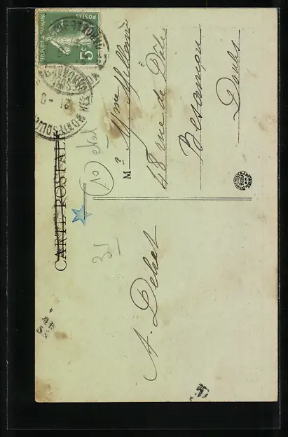 Personenbezogene Daten auf der Rückseite der Karte wurden durch blauen Textmarker unkenntlich gemacht. Die blauen Stellen sind auf die Vorderseite durchgeweicht und wirken sich negativ auf das Postkartenfoto aus