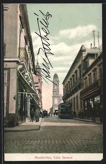 AK Montevideo, Calle Sarandi, Strassenbahn