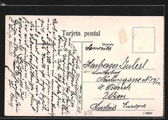 Personenbezogene Daten auf der Rückseite der Karte wurden durch blauen Textmarker unkenntlich gemacht. Die blauen Stellen sind auf die Vorderseite durchgeweicht und wirken sich negativ auf das Postkartenfoto aus
