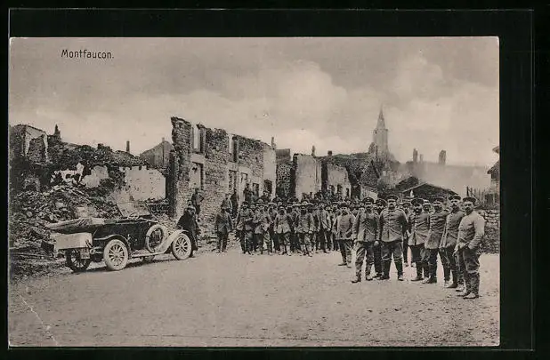 AK Montfaucon, Ruinen, Automobil, Soldaten