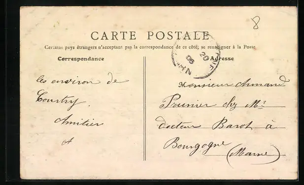 Personenbezogene Daten auf der Rückseite der Karte wurden durch blauen Textmarker unkenntlich gemacht. Die blauen Stellen sind auf die Vorderseite durchgeweicht und wirken sich negativ auf das Postkartenfoto aus