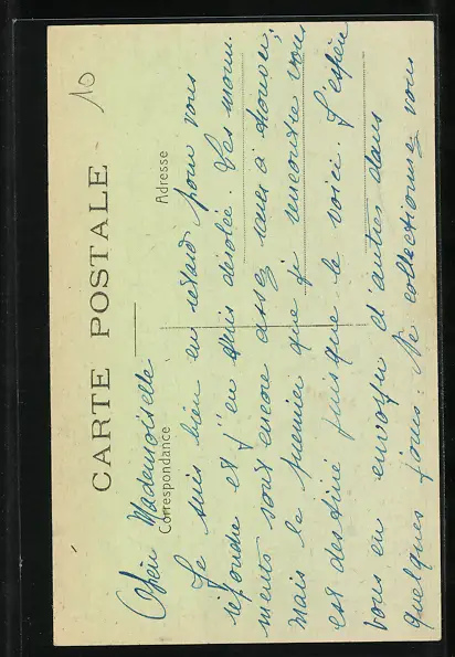 Personenbezogene Daten auf der Rückseite der Karte wurden durch blauen Textmarker unkenntlich gemacht. Die blauen Stellen sind auf die Vorderseite durchgeweicht und wirken sich negativ auf das Postkartenfoto aus