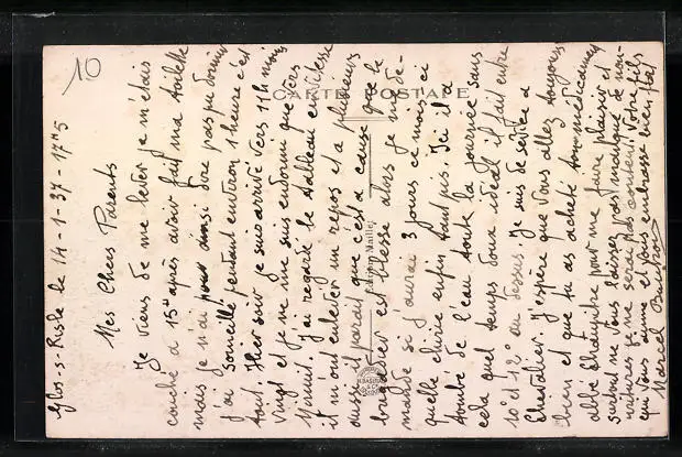 Personenbezogene Daten auf der Rückseite der Karte wurden durch blauen Textmarker unkenntlich gemacht. Die blauen Stellen sind auf die Vorderseite durchgeweicht und wirken sich negativ auf das Postkartenfoto aus