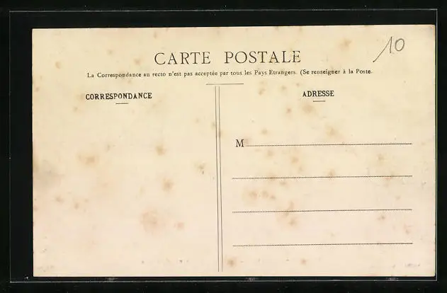 Personenbezogene Daten auf der Rückseite der Karte wurden durch blauen Textmarker unkenntlich gemacht. Die blauen Stellen sind auf die Vorderseite durchgeweicht und wirken sich negativ auf das Postkartenfoto aus