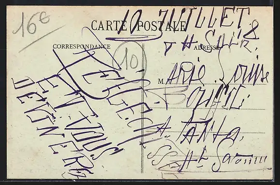 Personenbezogene Daten auf der Rückseite der Karte wurden durch blauen Textmarker unkenntlich gemacht. Die blauen Stellen sind auf die Vorderseite durchgeweicht und wirken sich negativ auf das Postkartenfoto aus