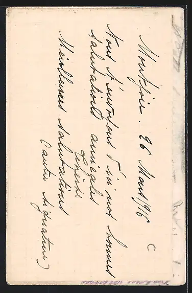 Personenbezogene Daten auf der Rückseite der Karte wurden durch blauen Textmarker unkenntlich gemacht. Die blauen Stellen sind auf die Vorderseite durchgeweicht und wirken sich negativ auf das Postkartenfoto aus