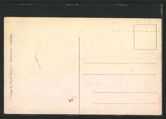 Personenbezogene Daten auf der Rückseite der Karte wurden durch blauen Textmarker unkenntlich gemacht. Die blauen Stellen sind auf die Vorderseite durchgeweicht und wirken sich negativ auf das Postkartenfoto aus