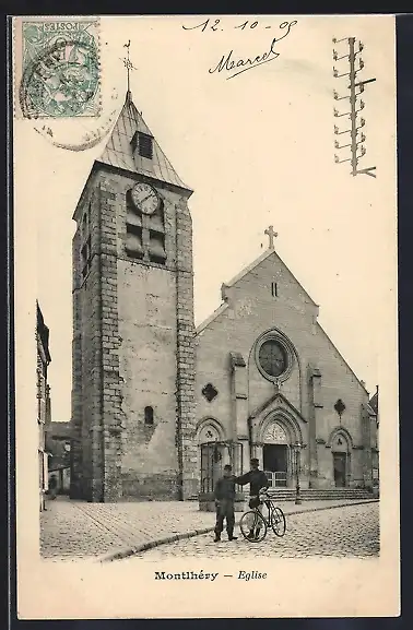 AK Montlhéry, Église avec horloge et passants devant l`entrée