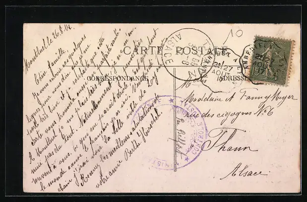 Personenbezogene Daten auf der Rückseite der Karte wurden durch blauen Textmarker unkenntlich gemacht. Die blauen Stellen sind auf die Vorderseite durchgeweicht und wirken sich negativ auf das Postkartenfoto aus